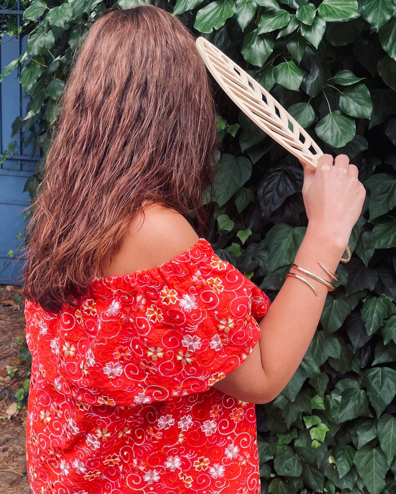 Chez Mannoé on a conçu la plupart de nos pièces pour qu'elles s'adaptent à de nombreuses tailles et nous avons testé l'ensemble de l'armoire Mannoé sur différentes morphologies. La blouse grenade convient à un 34/36 comme à une taille 42/44, son élastique et sa coupe vaporeuse s'ajustent aux épaules.