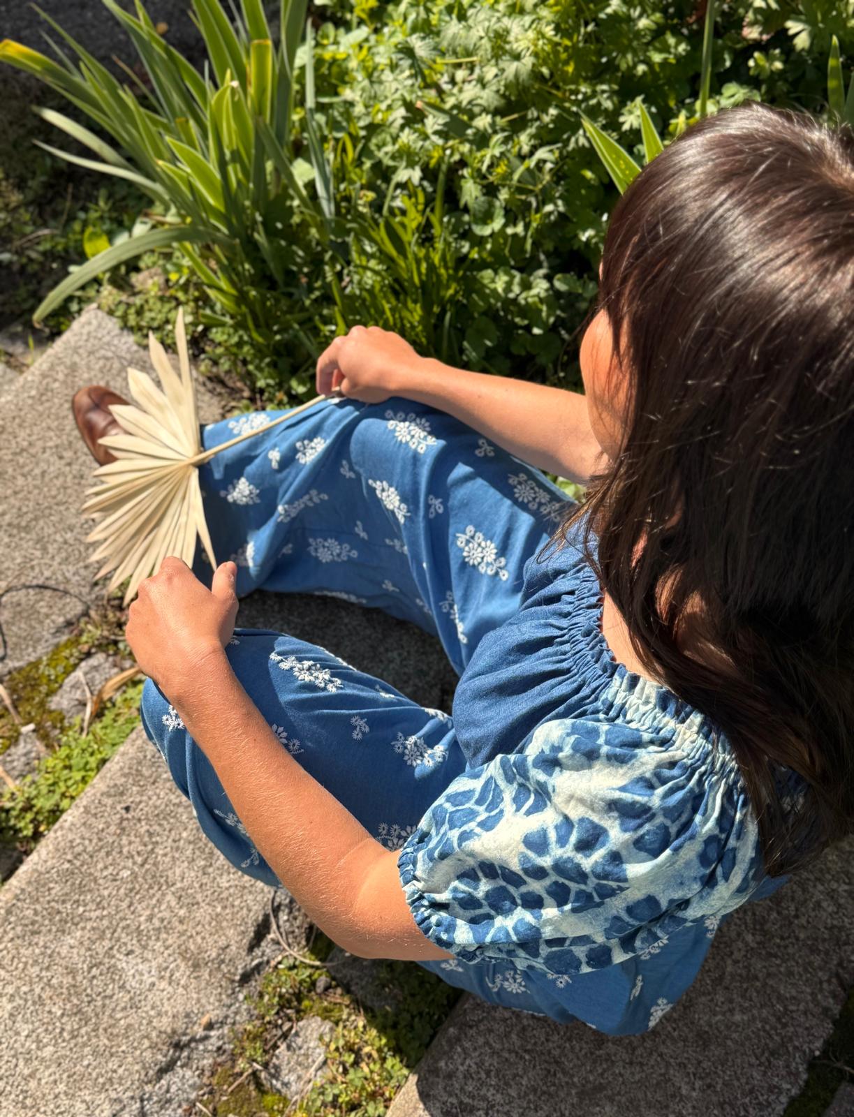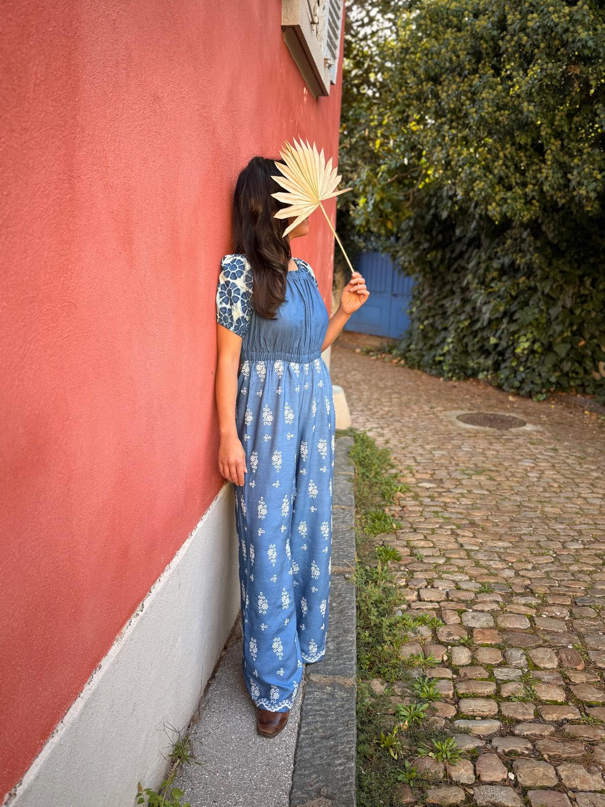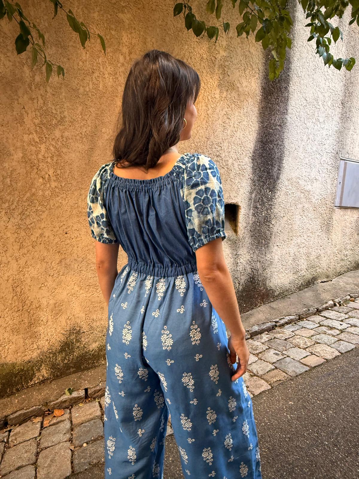Pièce phare de la collection Soleil Bleu, la combinaison Flavia fait la part belle aux camaïeux de bleus et accorde le denim avec le batik. 🦋🧵