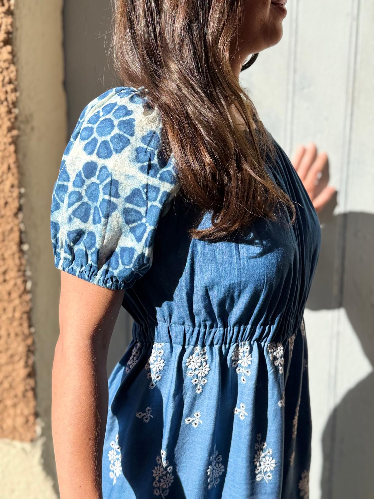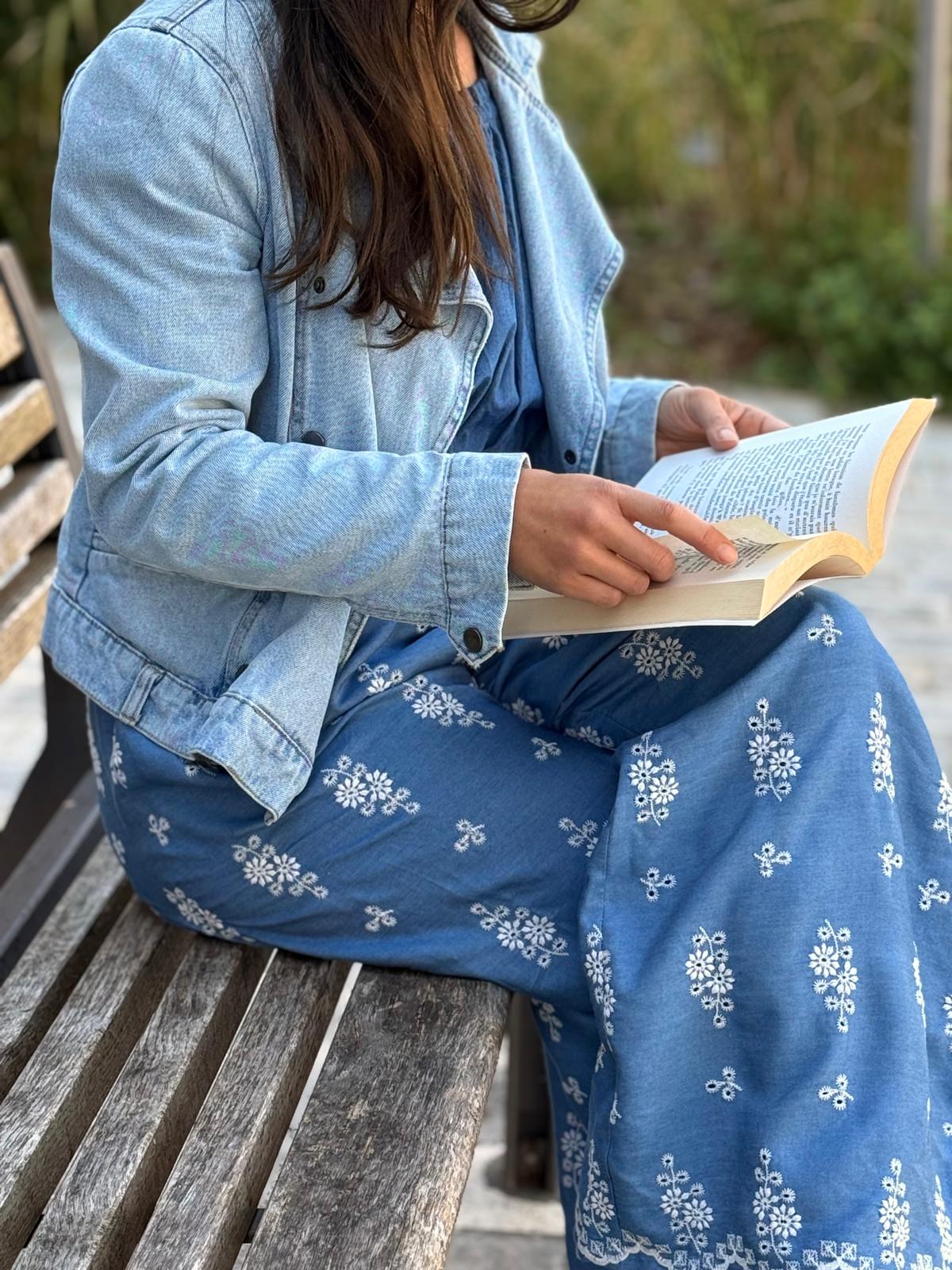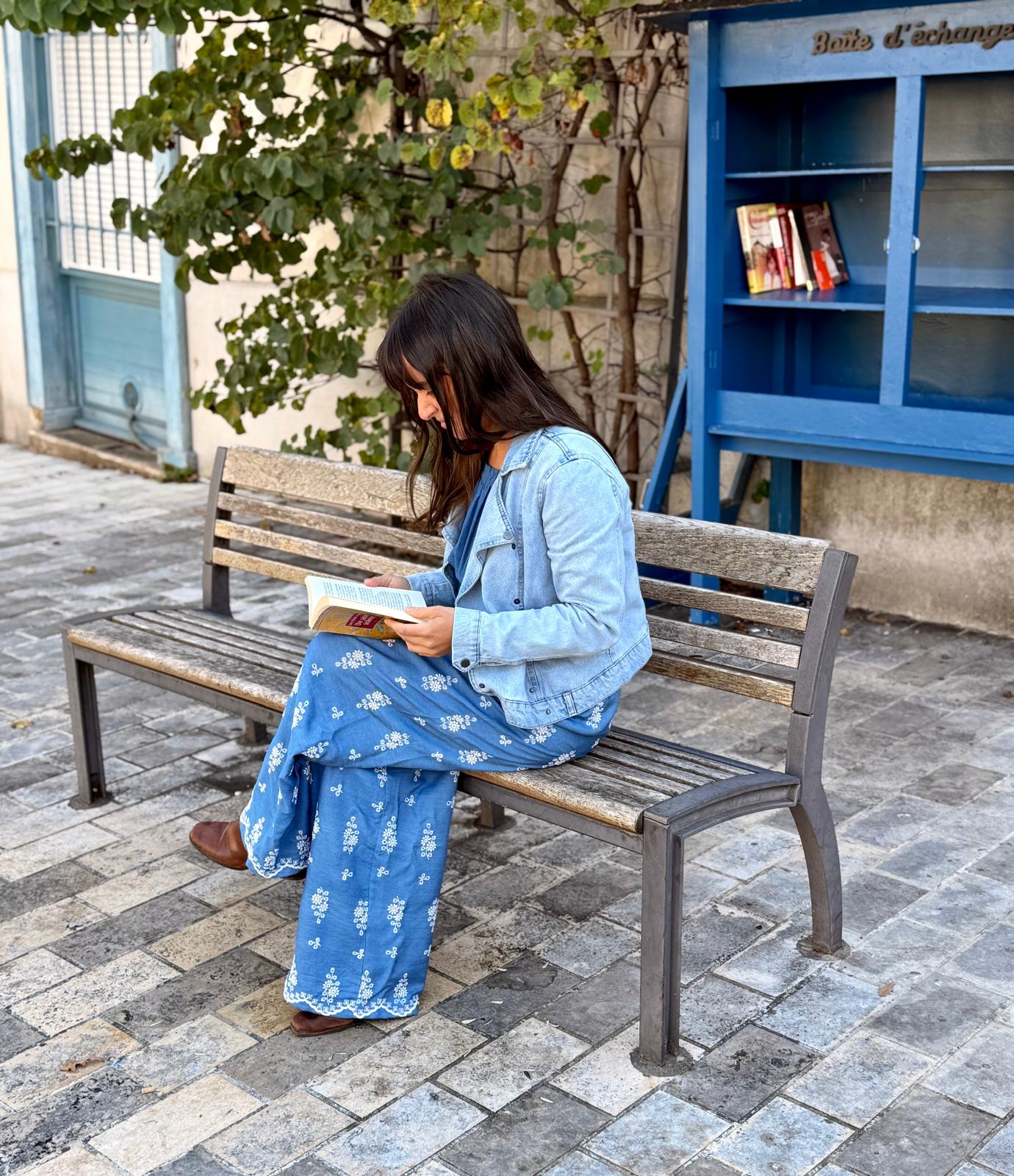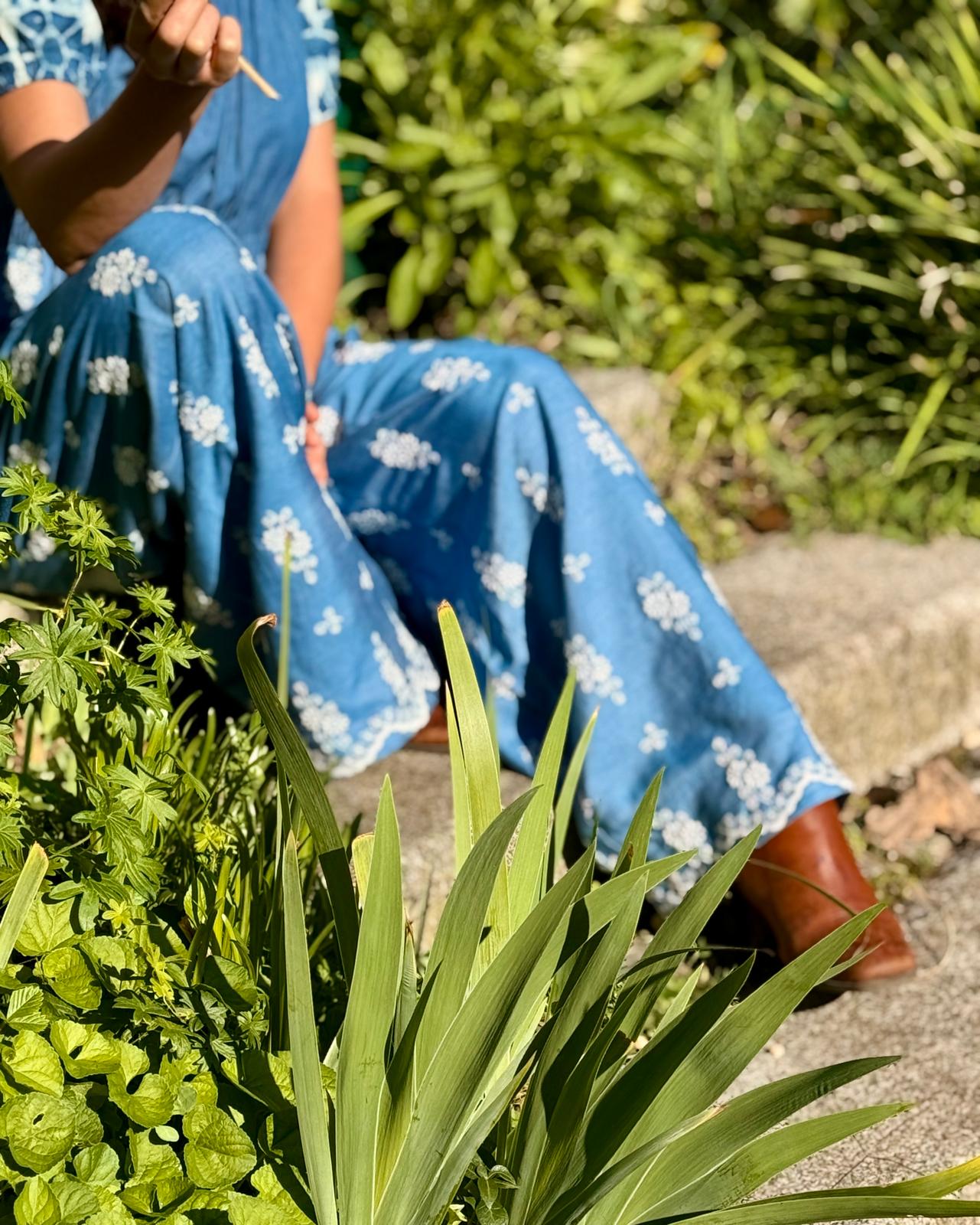 Pièce phare de la collection Soleil Bleu, la combinaison Flavia fait la part belle aux camaïeux de bleus et accorde le denim avec le batik. 🦋🧵