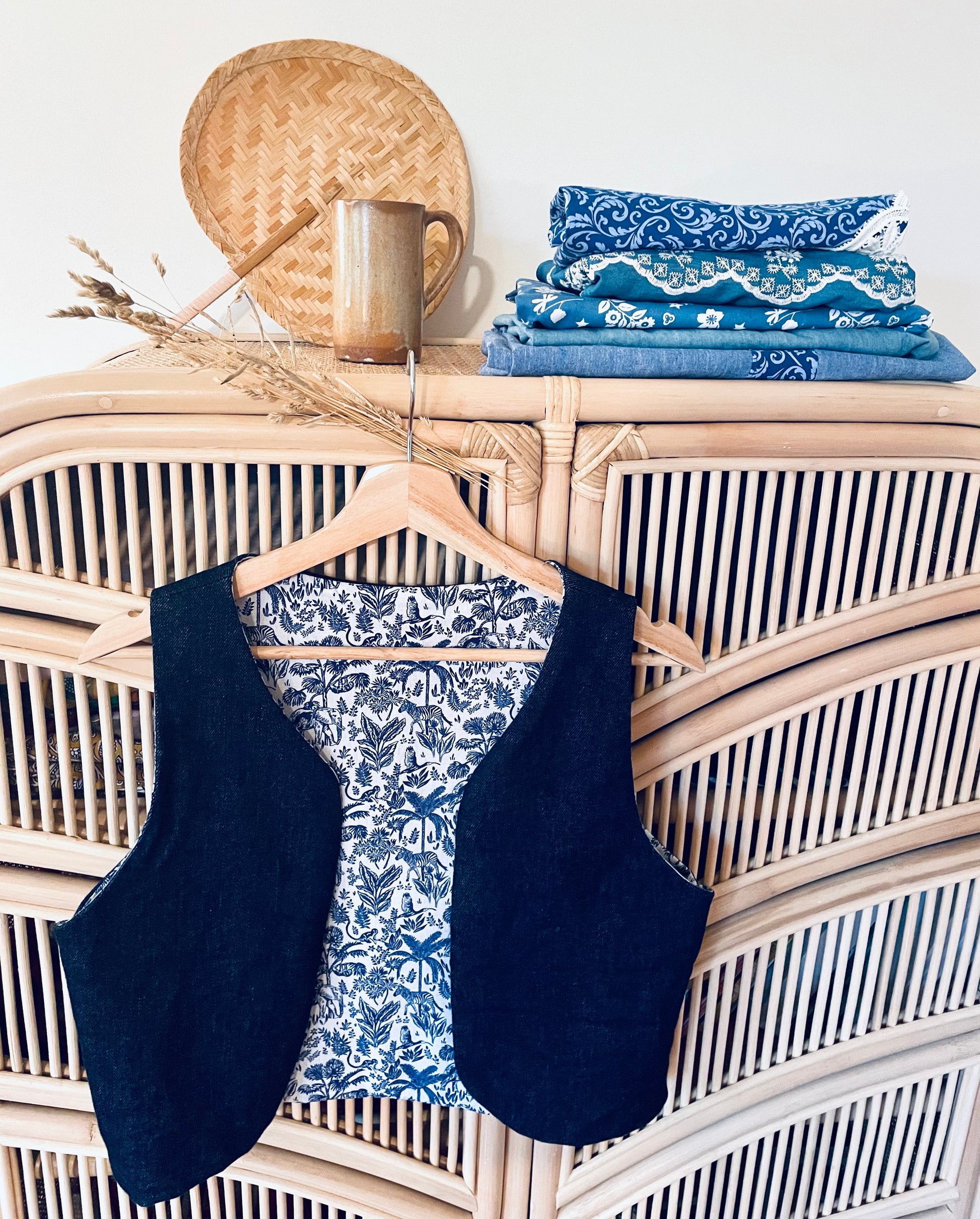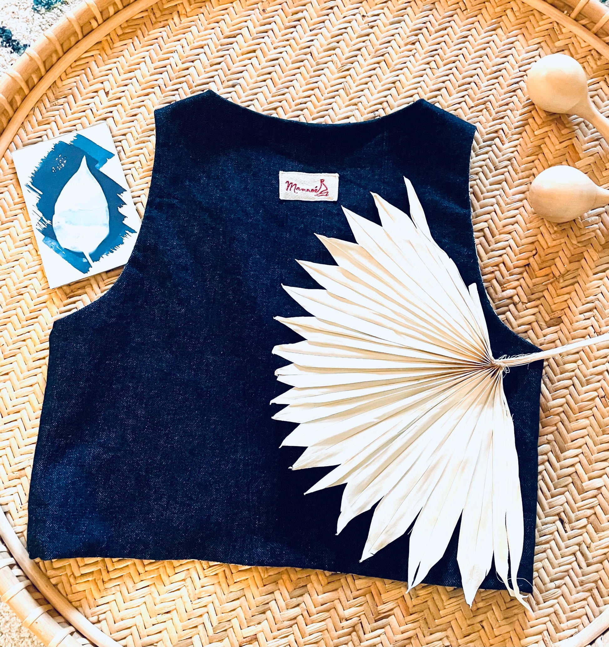 En denim brut et doublure Bleu de Jouy, ce gilet se porte aussi bien sur une blouse qu’un pull en laine.