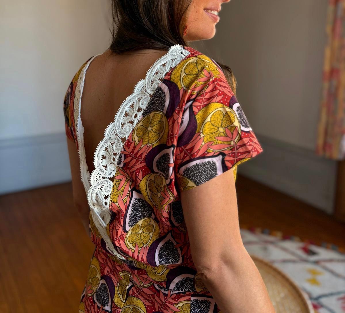 100% coton, sa taille est ajustée, les jambes larges et un décolleté dans le dos pour lui donner son chic en toute féminité.