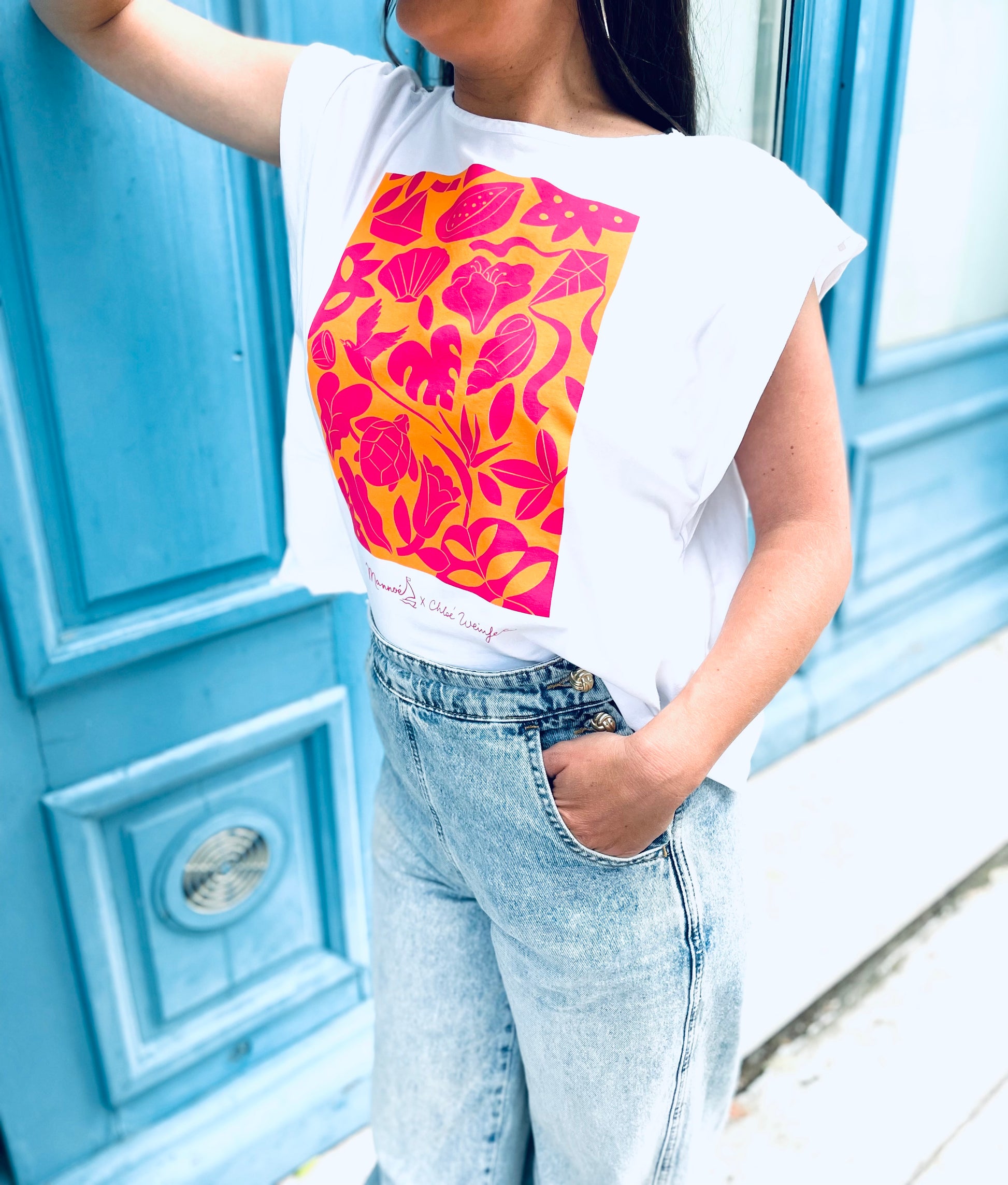 L’œuvre pleine de pep’s que l’artiste Chloé Weinfeld a imaginé pour ce projet, nous transporte sur l’île de la Réunion. Une œuvre d’art haute en couleurs à porter et emporter partout.